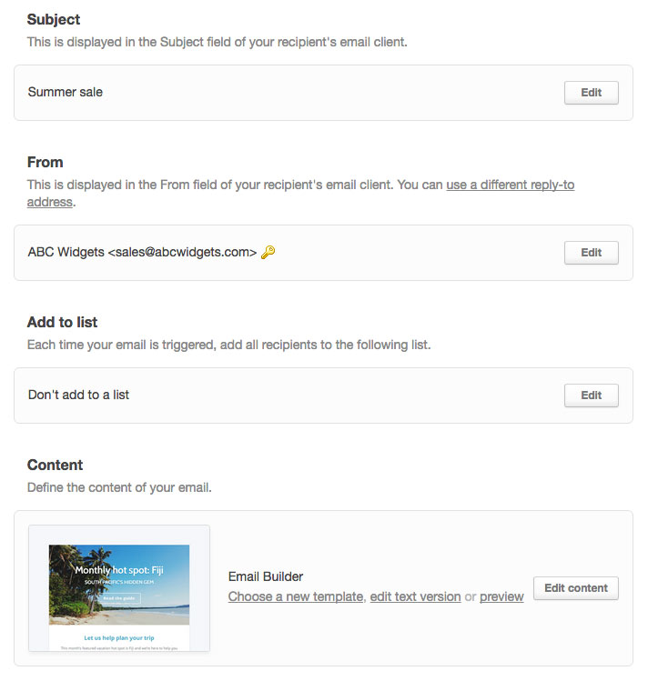 With your email designed and ready to send, the next thing you'll see in our application is a message that reads "Ready to start triggering". If you're not the person adding email triggers to your application or website, this is where they take over.